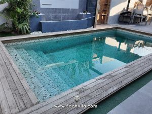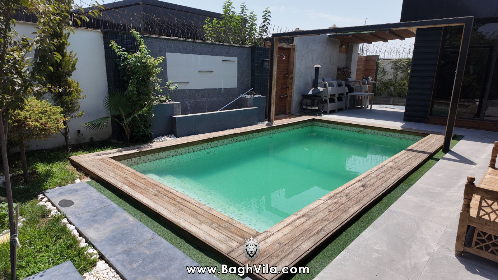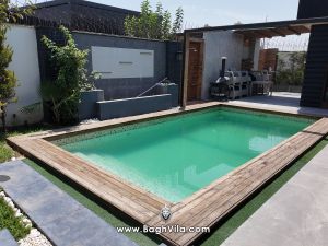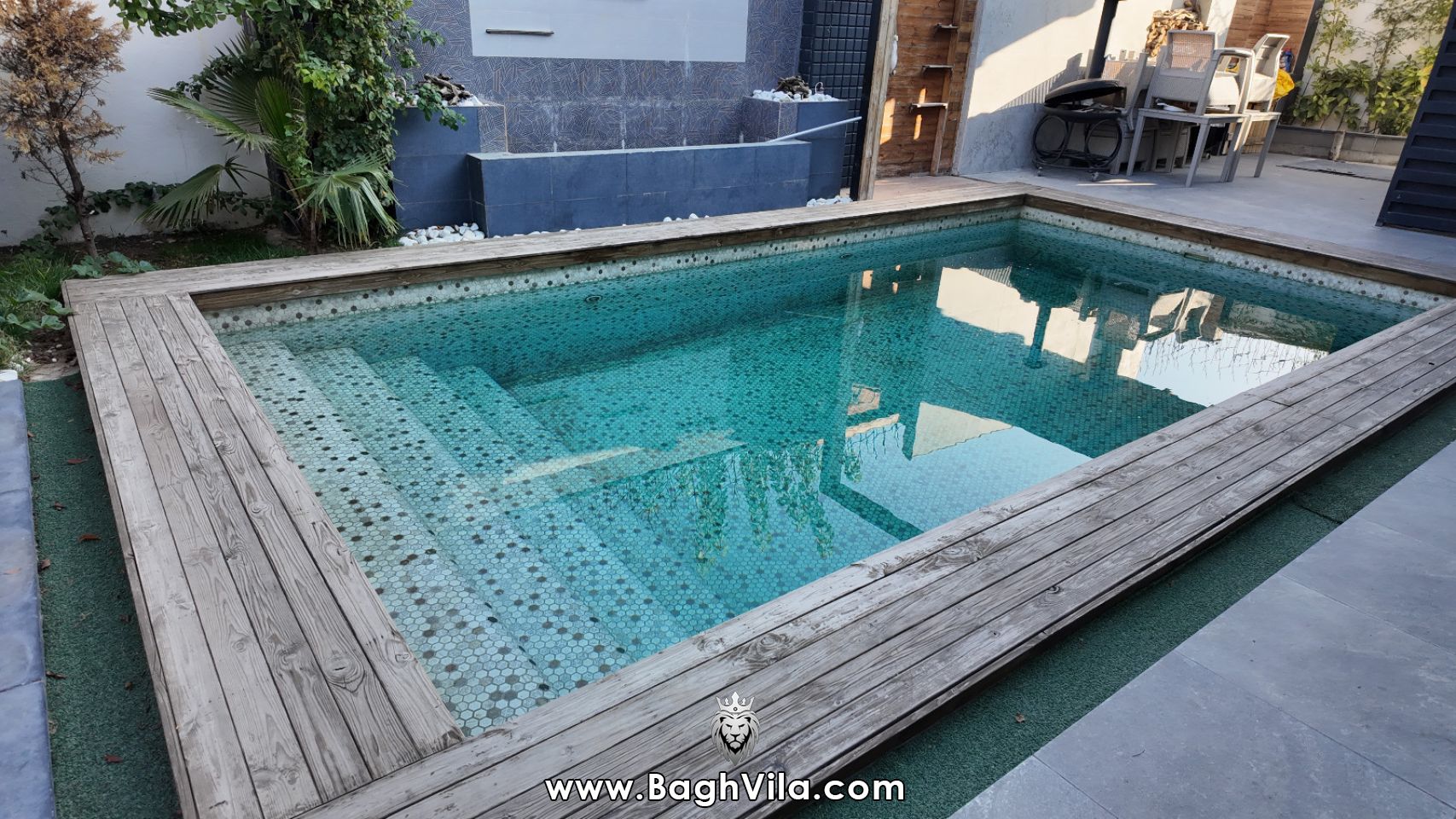 استخر فول ، با تصفیه و آبشار روی استخر و آبنما در کنار استخر